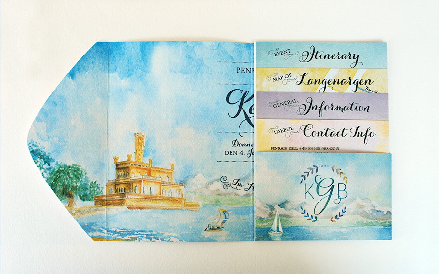 Bilingual wedding invitation with custom watercolor illustrations. Created two separate invitation versions for each language, one for German and one for English. It was a destination wedding so the goal was to create a “packet” style invitation that guests could break off and take it with to the town where the wedding was held.